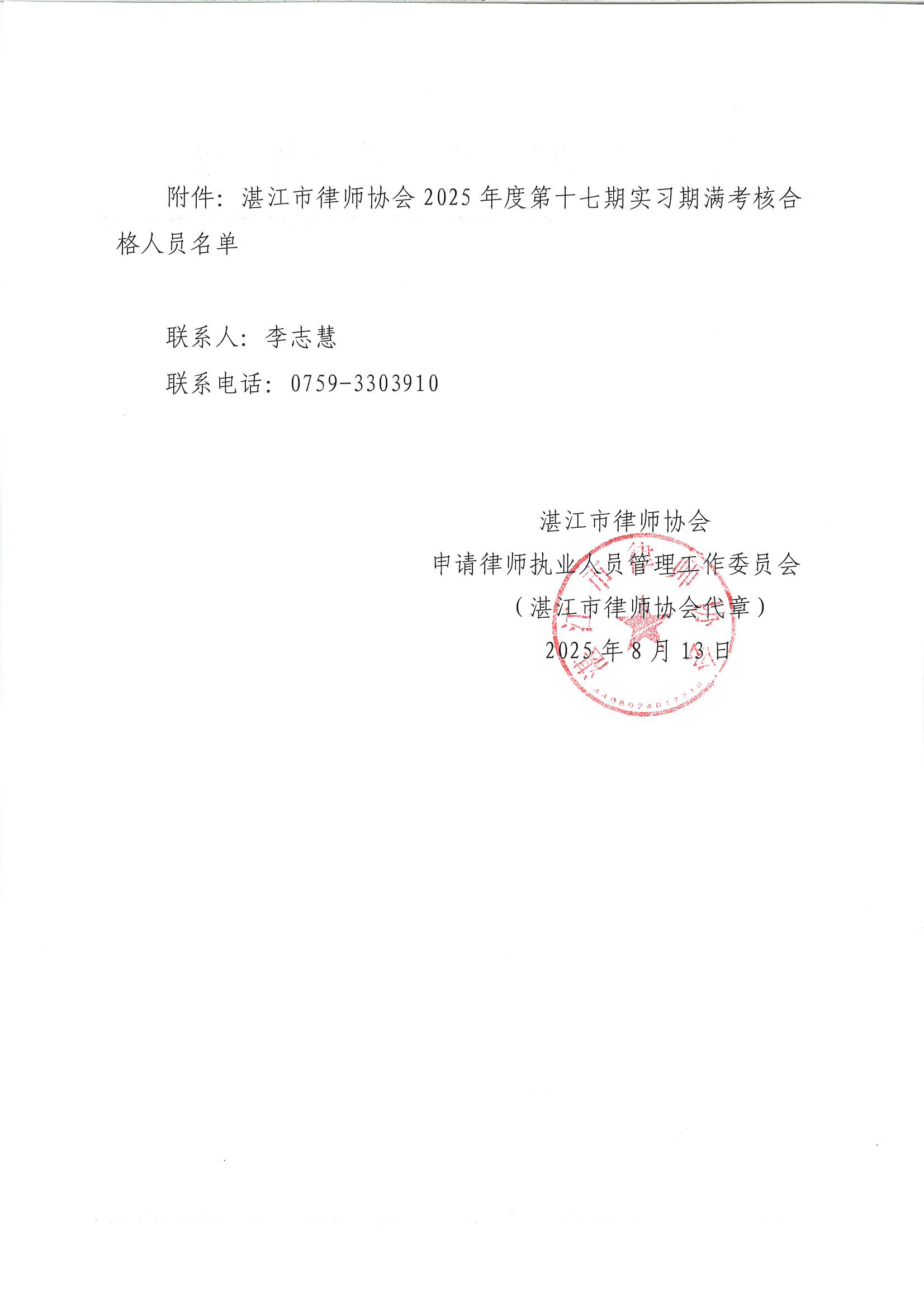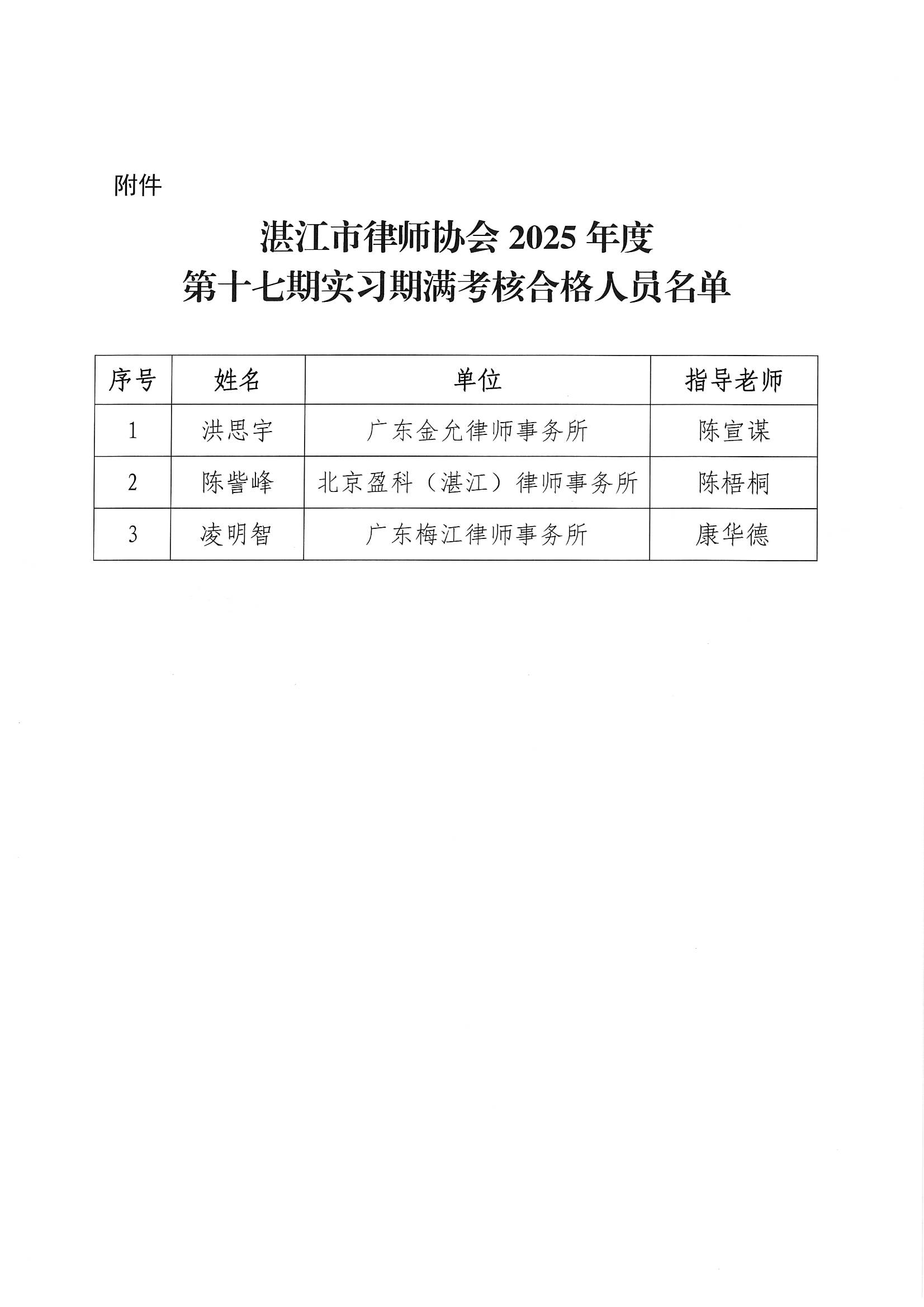 湛江市律师协会2025年第十七期申请律师执业人员实习期满面试考核结果公示