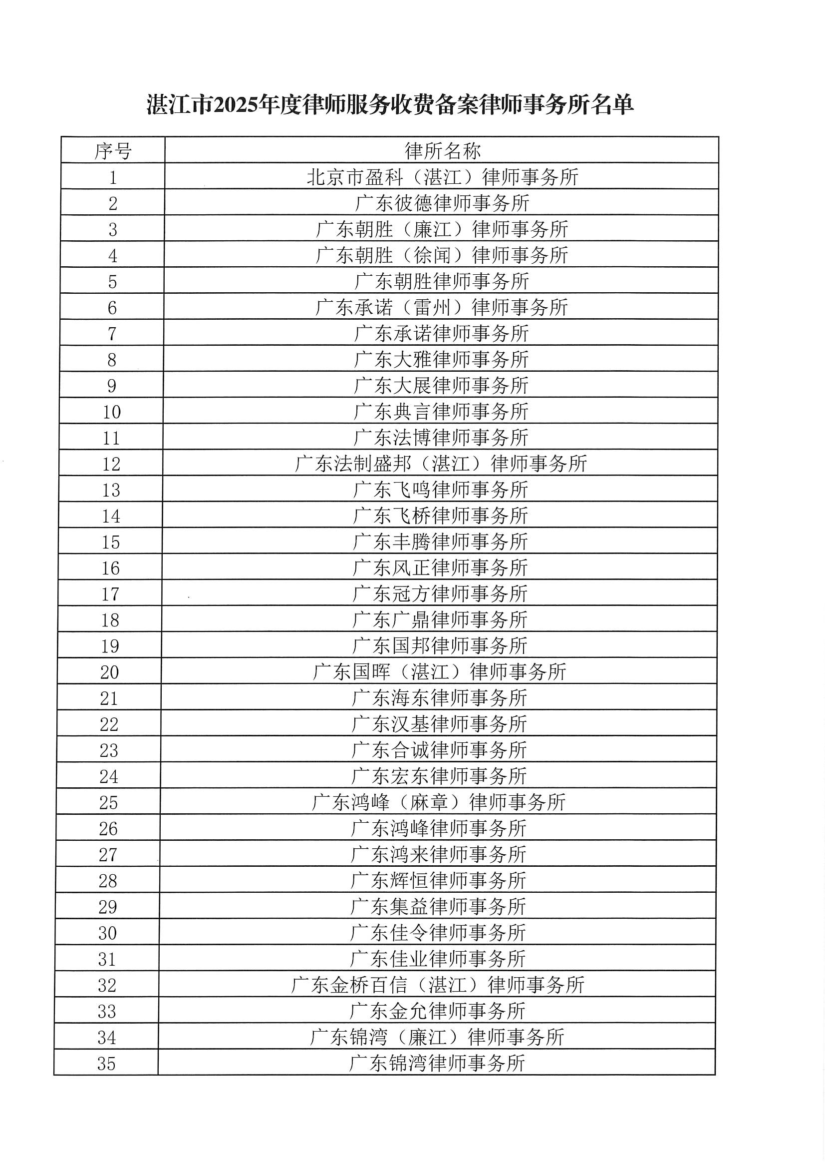 根据《关于进一步规范律师服务收费的意见》(司发通[2021]87号)《广东省律师事务所律师服务费标准备案管理办去(试行)》相关工作要求,按照《广东省律师协会关于做好2025年度律师事务所律师服务费标准备案工作的通知》(粤律协[2025]53号)工作部署,已完成2025年度我市律师服务收费备案工作,现将已备案的律师事务所名单予以公示。