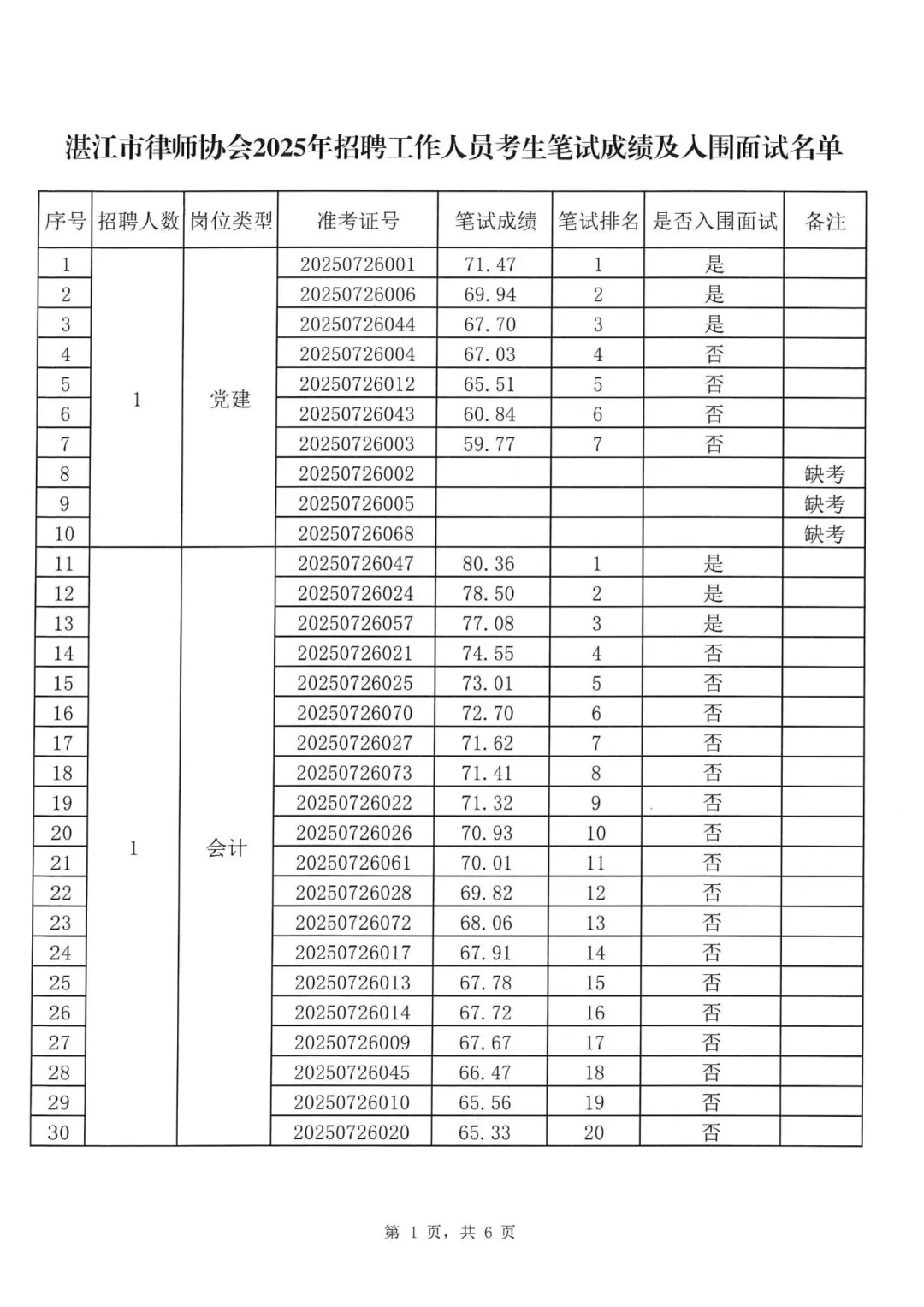 根据《湛江市律师协会2025年招聘工作人员公告》,现将湛江市2025年公开招聘工作人员考生笔试成绩及入围面试名单公示如下(详见附件)。公示时间:2025年7月29日至8月5日监督电话:0759-3303910另,具体面试事宜请考生留意湛江市律师协会的通知,并保持通讯畅通。附件:湛江市律师协会2025年招聘工作人员考生笔试成绩及入围面试名单湛江市律师协会