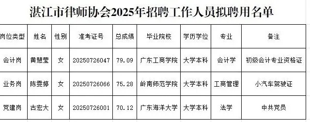 湛江市律师协会2025年招聘工作人员拟聘用名单公示