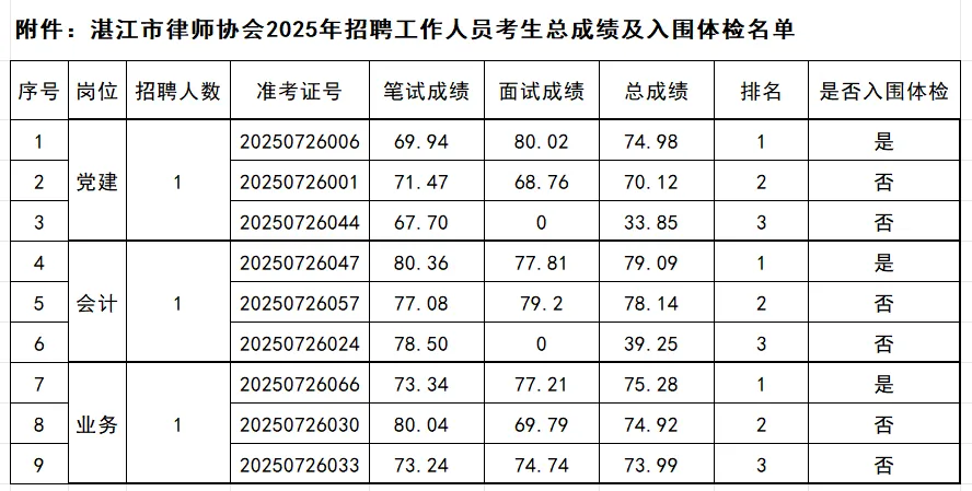附件:湛江市律师协会2025年招聘工作人员考生总成绩及入围体检名单