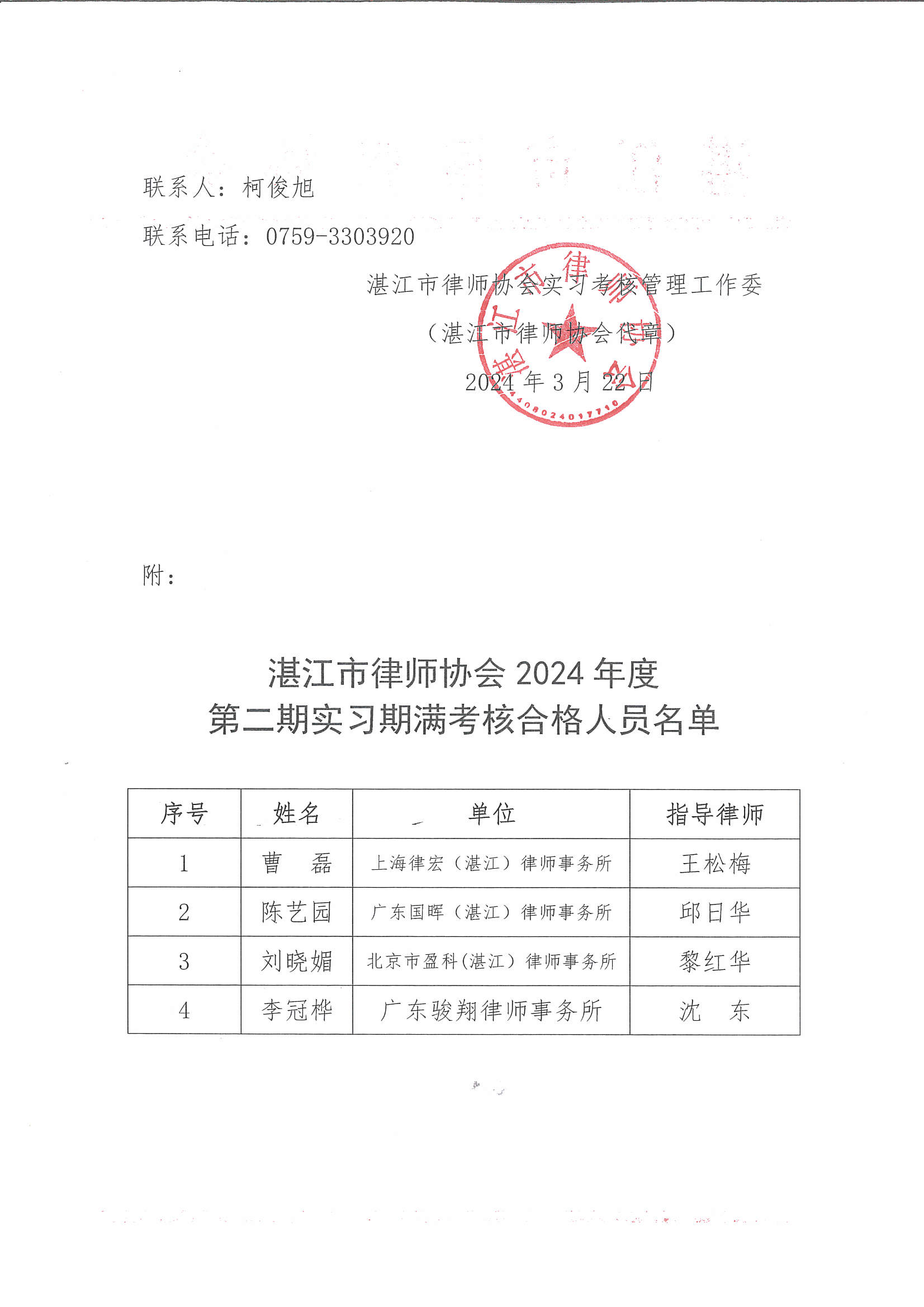 湛江市律师协会申请律师执业人员实习期满面试考核结果公示